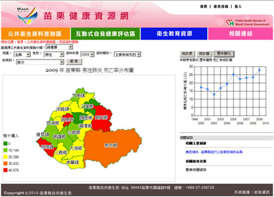 To provide with a map service web for citizens to query public health information, the Public Health Bureau of Miaoli County Government adopts SuperWebGIS to establish the “Miaoli Health Resource Web.” The web mainly provides three types of information: public health information query, interactive personal health evaluation and health education. With the integration of map display and database, the citizens can query the statistics on causes of death in recent years in each town through the web browsers and get the further health information.