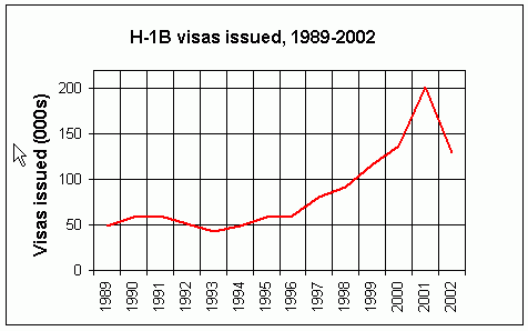 The past few years have seen a dramatic slowdown in the number of Indian H-1B workers entering the United States. Not all of this can be explained by the drop in the number of visas issued, because the share of Indian workers went down as well. A number of factors no doubt contributed to the decline. First was the bursting of the "tech bubble" which resulted in numerous hi tech firms going out of business and many people losing their jobs. Not surprisingly, the demand for new programmers and systems analysts from overseas declined precipitously. Further contributing to this slowdown was the dramatically altered security environment following 9/11. Issuance of visas and permits became subject to much more stringent regulations, and there was a dampening effect on immigration in general
