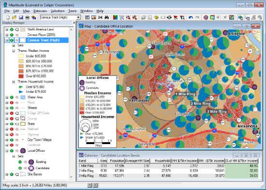 This excellent map-based business data analyzer is a smart addition for any organization running Windows and Office who wants to do geographic analysis.Business Geographic TreatsRecently, on my way to a business lunch in an unfamiliar city,I pulled up Google Maps on my smart phone and entered the restaurant address. Instantly, a map appeared on my screen, and after adding my starting location, I quickly navigated to a street view with a route map showing how to travel to the meeting. (We didn’t try this on an iPhone, but finding landmarks such as restaurants using Apple Maps has been well discussed elsewhere, see ).Amazingly, digital maps have become a routine and important part of our daily lives. You can thank players such as Google Maps, Microsoft Bing Maps, MapQuest, and NOKIA Maps. They have successfully popularized the use of maps via their simple web-based interfaces that seamlessly access geographically referenced “big” data. But today’s mapping software far exceeds the simple programs that produce directional maps. Even before these nifty location-based tools, years of development in digital cartography and data resulted in a global geospatial industry now worth up to $270 billion per year (see ). One element of this sector is the Geographic Information Systems (GIS) software market. Also known as business geographics, GIS programs portray demographic and market data on a map to aid in estimating trade area population for retail stores, uncovering target neighborhoods for marketing, analyzing prospective business locations, and routing deliveries. Users, however, complain that GIS systems are expensive, confusing, and difficult to use. For organizations dependent upon geographic analysis, GIS can bear a high price tag: tens of thousands of dollars in software, data acquisition, and personnel costs for dedicated staff. Fortunately, at least one software vendor, Caliper Corporation, recognizes that everyone uses maps in some way and that many organizations need to analyze data spatially. Caliper also realizes that most business users don’t want to become mapping experts, they just want to produce ring studies, thematic “heat” maps, and a range of other informative map displays without unnecessary complexity. In response, Caliper has created mapping software you can easily incorporate into day-to-day operations with minimal expenditure. Caliper’s Maptitude is a cost-effective, professional mapping software product with a focus on usability. Maptitude enables organizations to leverage their location-based data to improve decision making and planning, while limiting expenditure through a competitively-priced solution.Bringing Mapping to the TableMapping software layers information, just as if you were using transparencies with a projector for a presentation. The layers can show addresses, boundaries, and also satellite or aerial imagery. The result is a single window containing multiple databases and spreadsheets displayed as a visually appealing map.