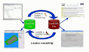 A Java/XSLT based transformation tool for the LandXML to LandGML transformation was built and tested.An online LandXML to LandGML transform demonstration was provided by Autodesk and is available at.TheLandGML to LandXML transform tool is an open source C++ console application based on Xerces C SAX parser.LandXML <-- --> LandGML DemonstrationA key part of the Interoperability Experiment was a demonstration of a "roundtrip" LandXML/LandGML transformation.In the demonstration, survey data for road alignments and parcels were encoded into LandXML, transformed to LandGML and then from LandGML back into LandXML.The final file was then ingested into AutoCAD and rendered.The roundtrip was 100% error free.