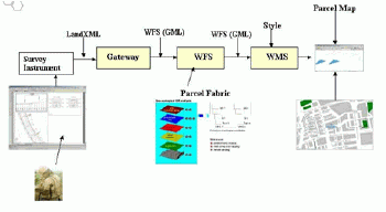 Click image for larger view.Putting a Standards Based CAD/GIS Workflow in PlaceThe following figure provides an example of how multiple OGC interface standards coupled with the LandXML/LandGML transformation tools can be integrated into a CAD/GIS workflow.