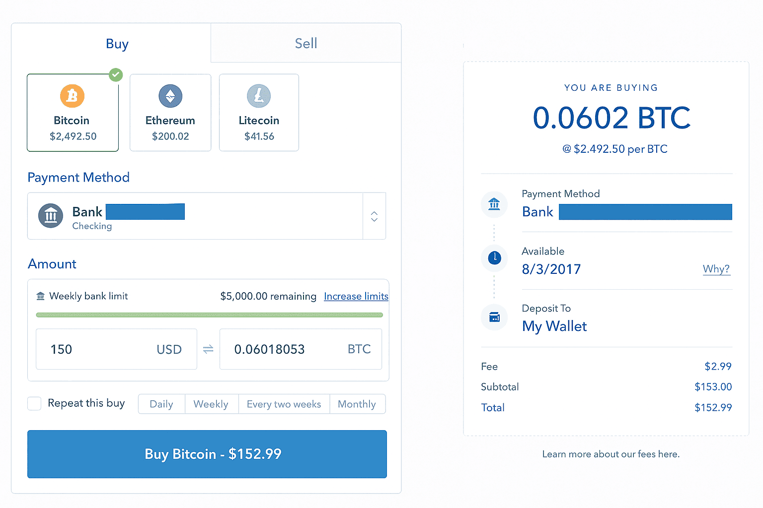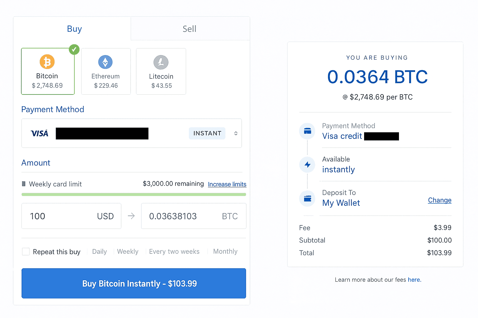 On Coinbase, you simply pick a payment method and review the real-time price before confirming your purchase.