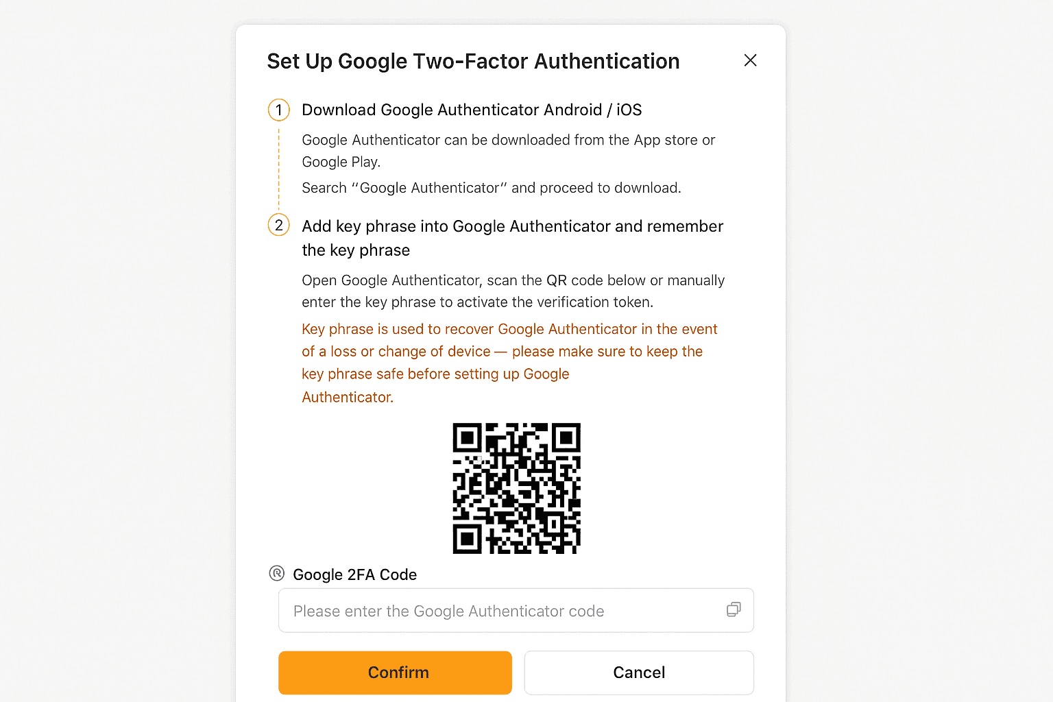 Step 5: On your phone, install Google Authenticator and scan the qr code displayed. Click [Confirm] again.