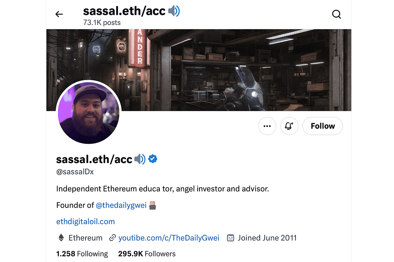 Sassal remains one of the strongest Ethereum advocates on the platform. His content explains ecosystem upgrades, DeFi mechanics, and technical developments with unusual clarity.
