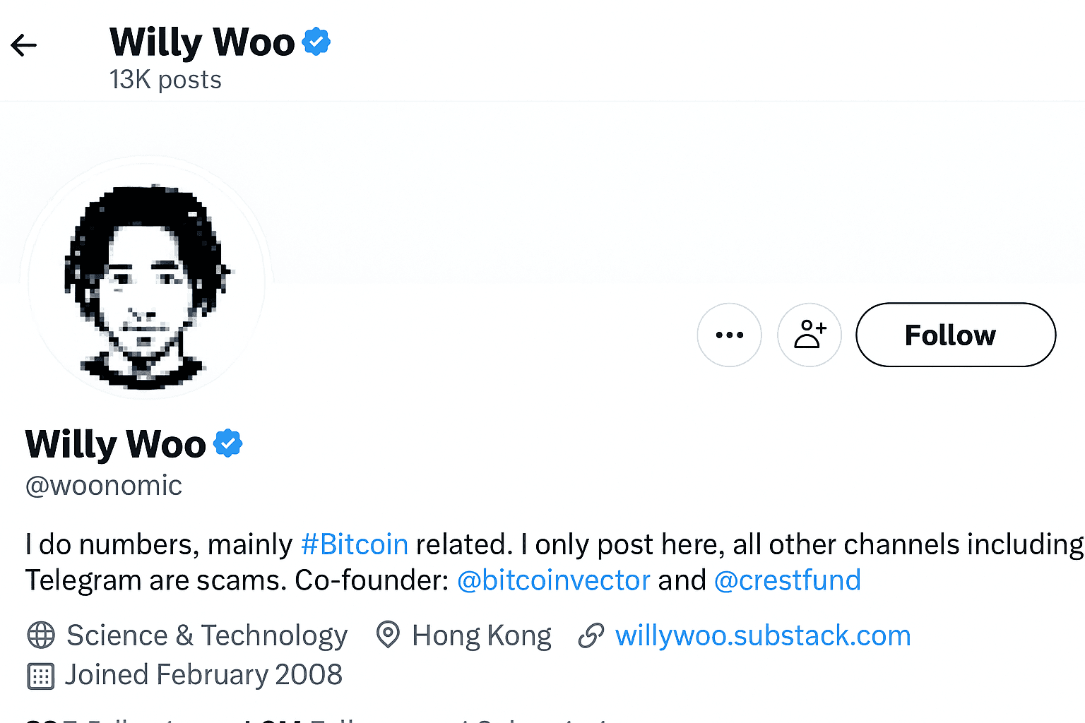 | Willy Woo | Bitcoin | On-chain data and network behavior | Search by name on Twitter/X |