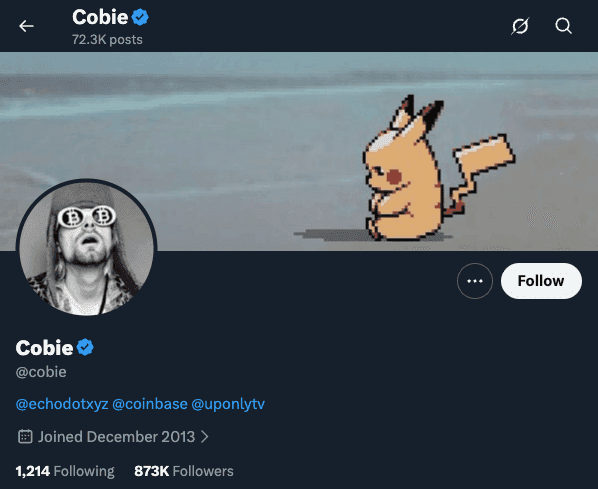 Cobie mixes humor with sharp commentary. His posts frequently cover Bitcoin, investor behavior, exchange dynamics, and the absurd side of crypto culture, including the occasional internet meme phenomenon.