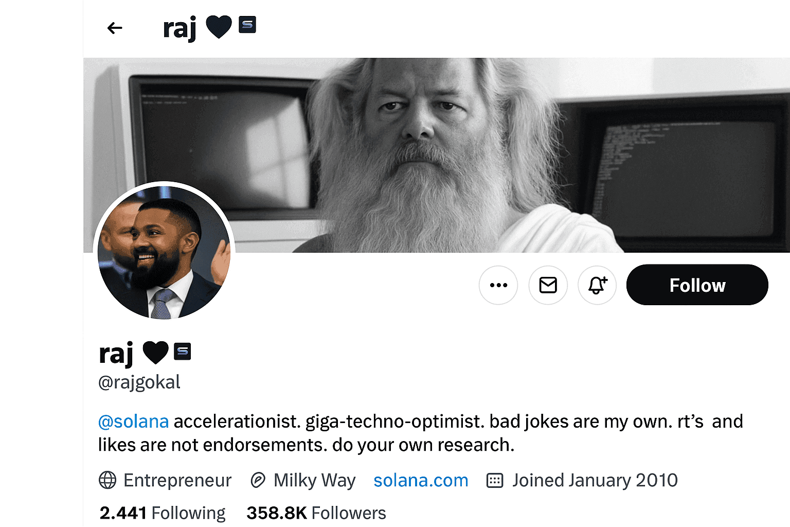 Raj, a Solana co-founder, often shares views on building high-performance networks and expanding user adoption across the Web3 landscape.