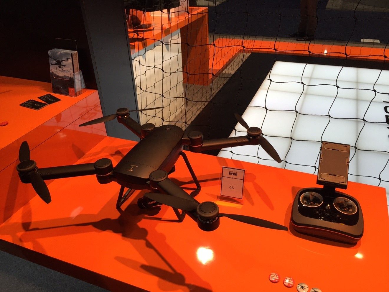 Parrot showcased their newly-announced Disco, a fixed-wing drone that can fly 50 mph for 45 minutes on a single charge. The nose camera can record 1080p video or 14 megapixel images.