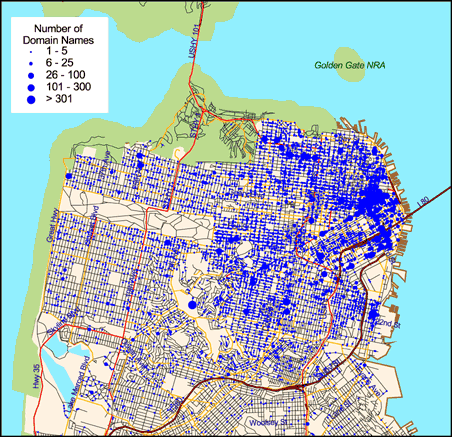 Millions of Internet domain names are registered by companies and individuals across the world.Matthew Zook is analyzing the geography of dot.com domains. He produced a series of domain name maps, from the regional scale down to the street in a number of selected US cities.This example shows San Francisco using proportional blue circle symbols on the map to represent the number of domain names at each particular postal code.The densest concentrations are in the financial district and 'South of Market' area - famed as the Multimedia Gulch.