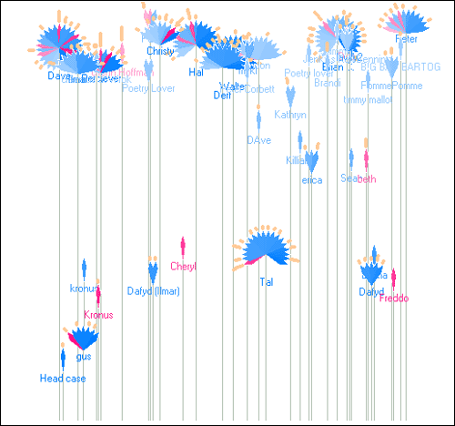 Cyberspace is full of conversations in chat rooms and on discussion boards.The problem of how to gain a sense of the social nature of discussion is difficult, particularly with conventional interfaces that just present a hierarchical listing of text messages.Rebecca Xiong's PeopleGarden is an interactive visual portrait of a conversation.Each garden represents a discussion list, each flower a person, and each petal a single message.The form and colour of the flower represents details on the number of messages posted, their temporal sequence, whether they were initial conversations or replies, and also the number of replies garnered in return from other participants.The overall growth of flowers in PeopleGarden can tell you much about the nature of the conversation.